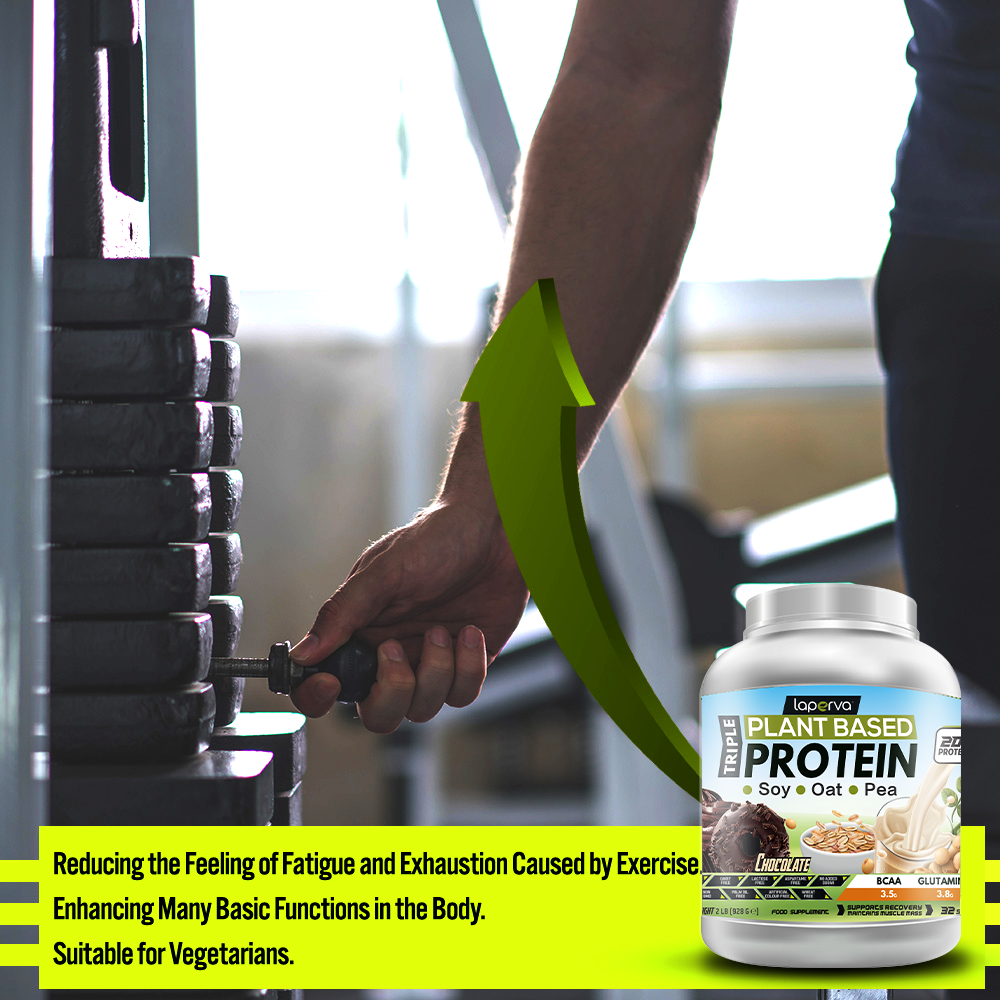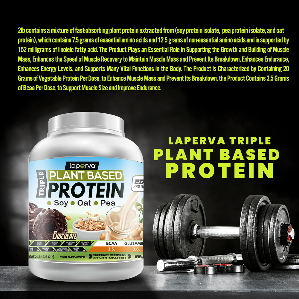 Laperva Triple Vegan Protein 2lb is a premium plant-based protein formula that combines soy protein isolate, pea protein isolate, and oat protein for fast absorption and maximum effectiveness. Each serving provides 20 g of vegetable protein, including 3.5 g of BCAAs and 3.8 g of glutamine, making it highly effective for muscle growth, recovery, endurance, and energy support. Enriched with 152 mg of linoleic acid (Omega 6), this supplement also contributes to overall vitality and healthy body functions.